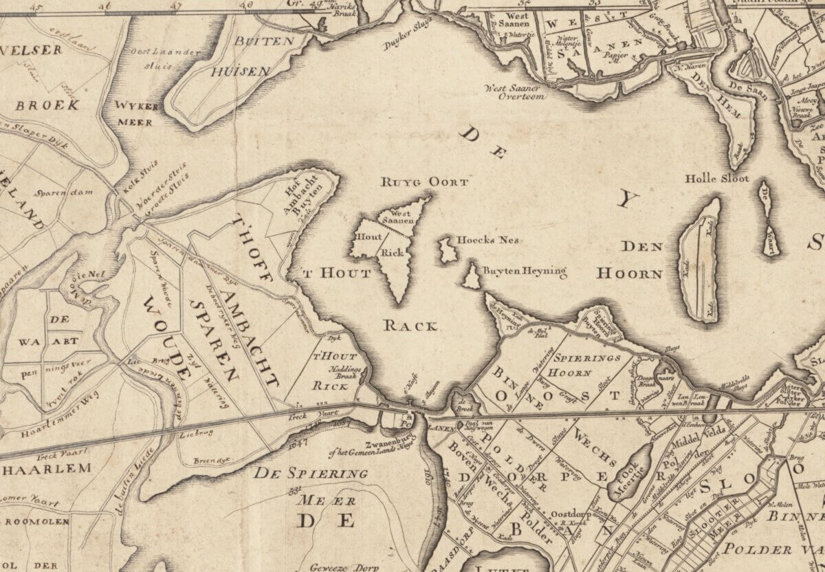 Ook ‘t Hout Rack, het water dat zich uitstrekte tussen de Spaarndammerdijk, Ruigoord en Buitenhuizen, is linksboven prominent zichtbaar op de kaart. De Houtrakpolder is in 1873 drooggelegd en maakt deel uit van de IJpolders.