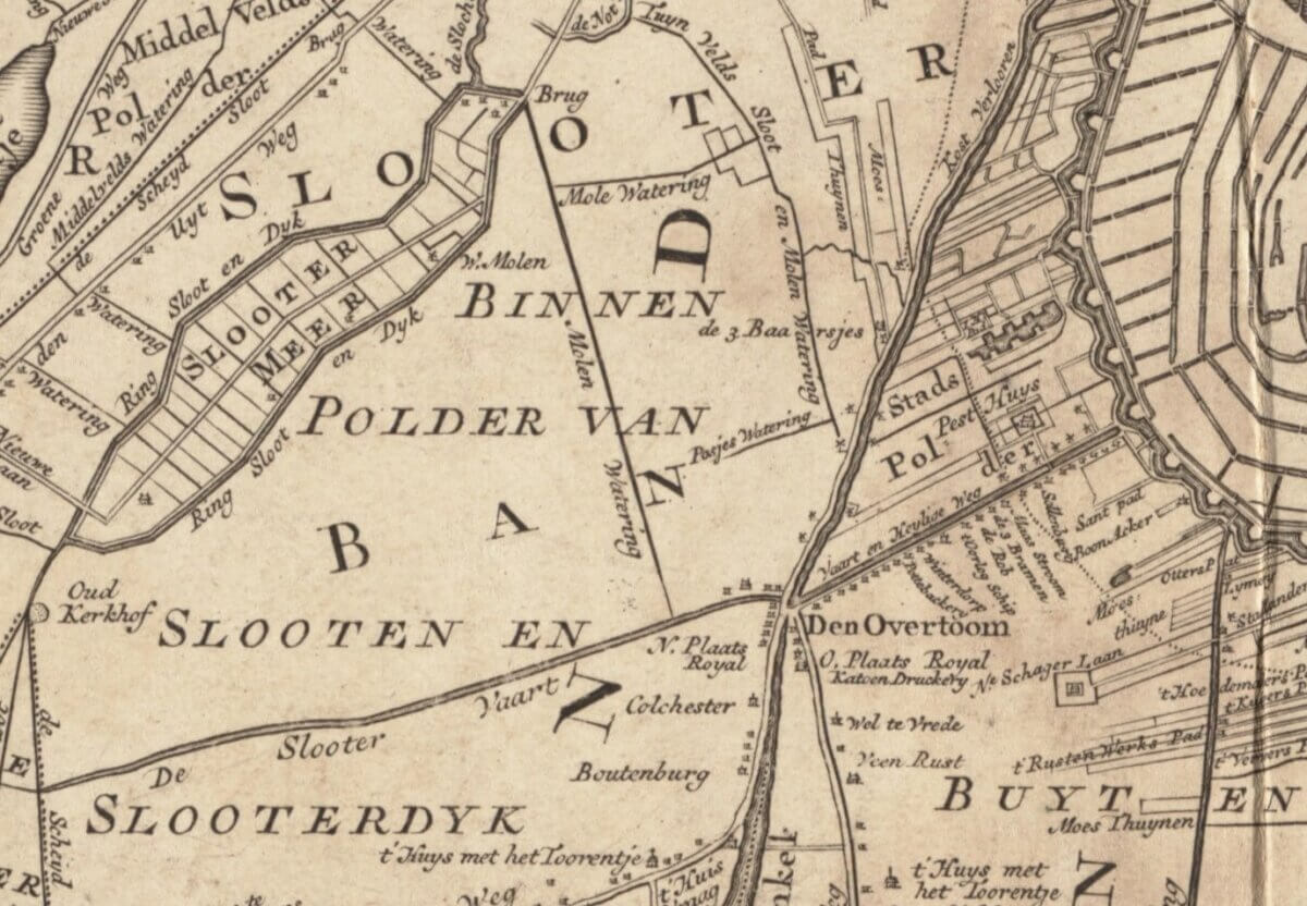Ook links op de kaart liggen ‘t Ook Meertje en het Slootermeer. Die laatste lag in de Sloterban, tussen de dorpen Sloterdijk en Sloten in. Het was een langgerekt meer, ontstaan door het zijriviertje de Slooter, dat het meer verbond met het IJ. Daardoor was er ontzettend veel vis in het Slootermeer te vinden, ondanks dat het in de zomer vaak droog stond. In 1644 werd het smalle meer drooggelegd, maar dat zou niet de laatste keer zijn. Tot 6 keer toe liep de polder door dijkdoorbraken onder en iedere keer weer werd de polder drooggemalen.