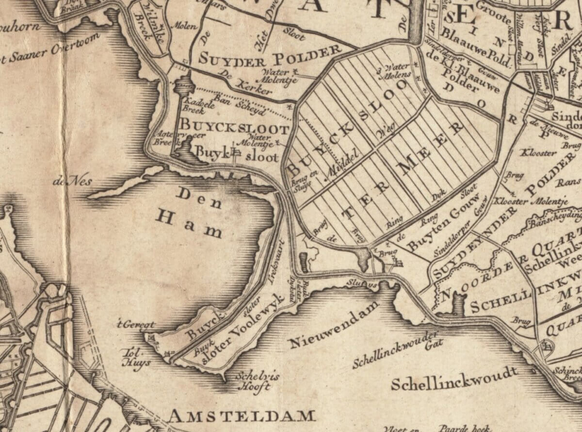 Het IJ was in die tijd veel breder dan nu, zoals te zien is op de kaart. Wat daar water is, zijn tegenwoordig de Nieuwendammerham en Buiksloterham. De hammen kregen hun vorm tijdens een indrukwekkend project: de aanleg van het Noordzeekanaal. Dit project maakte het brede IJ smaller en creëerde het kanaal zoals we dat vandaag de dag kennen. Door deze veranderingen ontstonden de Nieuwendammerham en Buiksloterham.