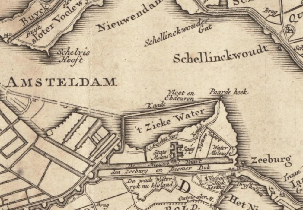 Sporenburg en Borneo zijn ook zichtbaar op de kaart, aan de rechterzijde. De levendige wooneilanden in het Oostelijk Havengebied hebben een fascinerende geschiedenis. Rond 1700 werd een stuk van het IJ afgebakend, eerst met palen en later met een stevige dijk. Dit ingesloten watergebied stond bekend als ’t Zieke Water.
