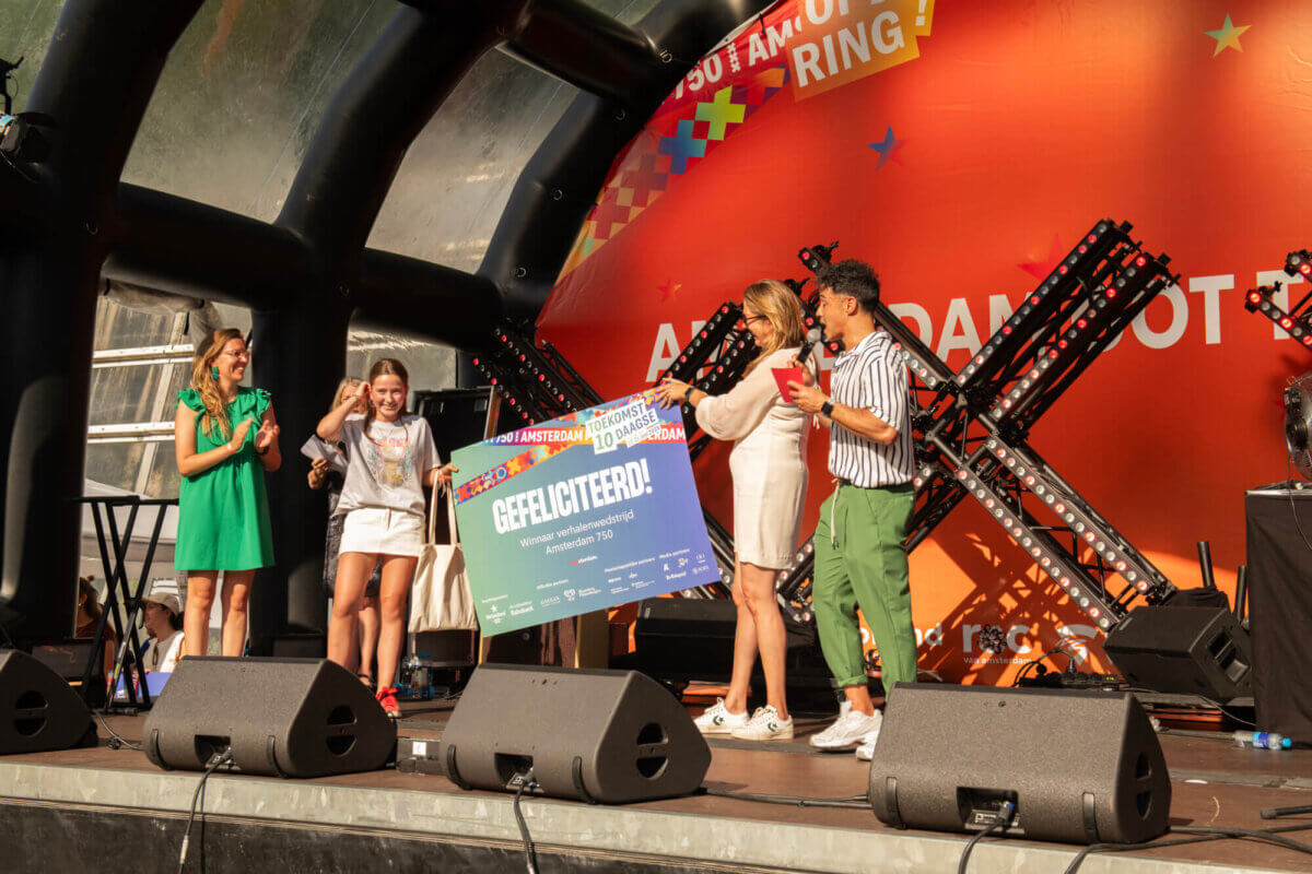 Alle leerlingen in het voortgezet onderwijs in Amsterdam zijn uitgenodigd om mee te doen aan de verhalenwedstrijd. Schrijf een mooi verhaal, gedicht of spoken word over “Mijn Amsterdam in de toekomst”. De mooiste inzendingen hebben een prijs ontvangen uit de handen van wethouder Marjolein Moorman tijdens het festival Op de Ring. De verhalen zijn gepubliceerd op het '750 verhalen' platform. De winnaars kregen met hun hele klas een leuk uitje aangeboden.